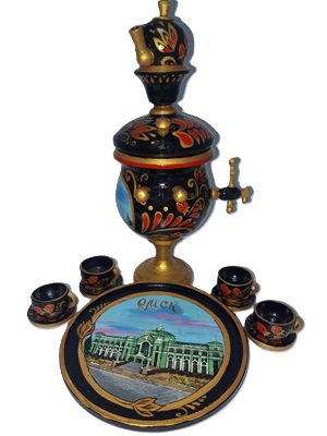 Самовар сувенирный с видами Успенского кафедрального собора и ЖД вокзала города Омска. Художественная авторская ручная роспись акриловыми красками. В комплект входит самовар, заварной чайник, 4 чашки и поднос. Материал – массив дерева (липа).